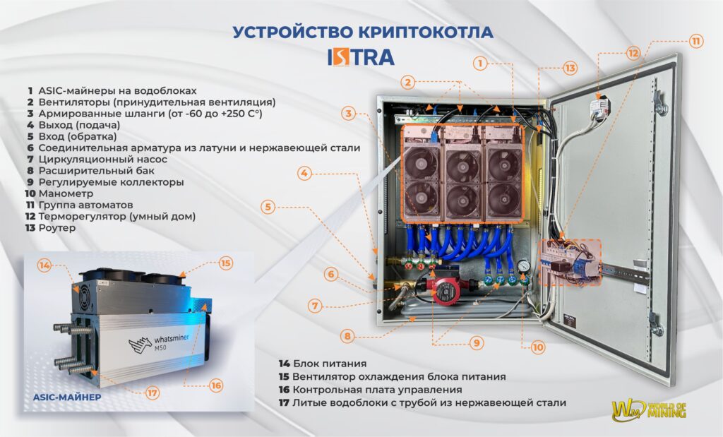 Главный компонент криптокотла – это асик (один или несколько), который выделяет большое количество тепла при добычи Биткоина. Соответсвенно, мы используем данное тепло для отопления дома, горячей воды, бассейна и т.д.